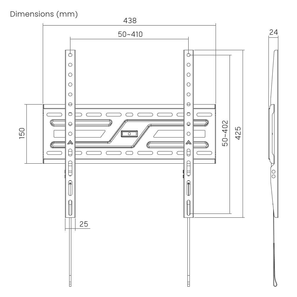 Kompatibilní s VESA: 75x75, 100x100, 100x150, 150x100, 100x200, 200x100, 150x150, 200x200, 200x300, 300x200, 200x400, 400x200, 300x300, 300x400, 400x300, 400x400